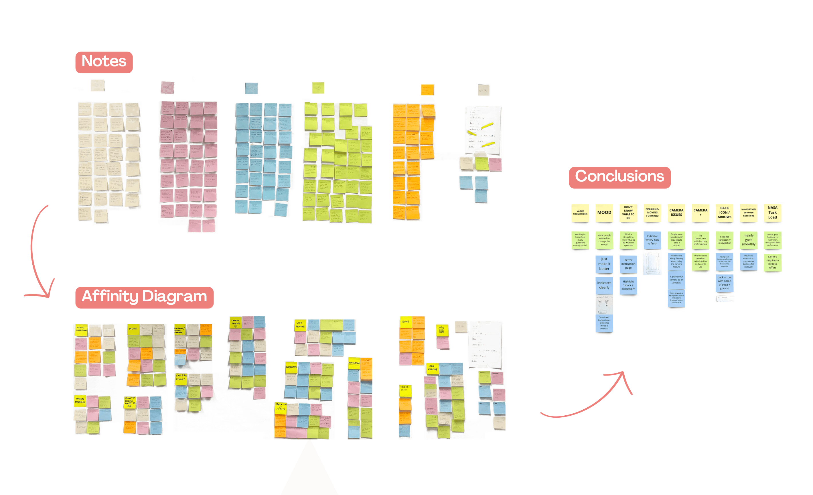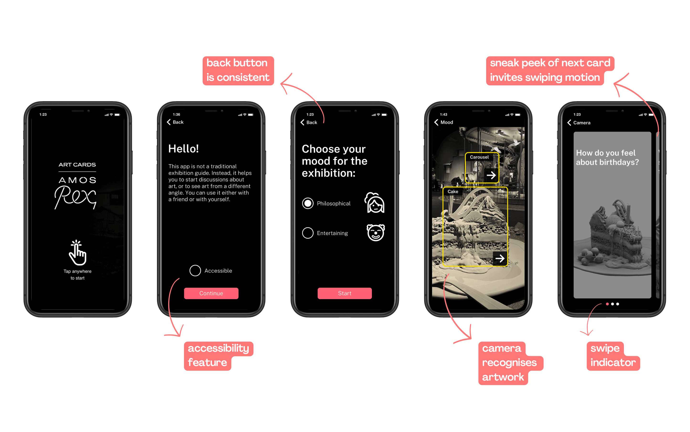 • Camera-based interaction feels more natural: 7 out of 8 participants preferred using the camera to recognise artworks over selecting from a list. • Consistency reduces confusion: Inconsistent navigation caused hesitation — especially around back buttons and progression. • Clear progression matters: Users needed stronger signals for when to continue to the next artwork or interaction.