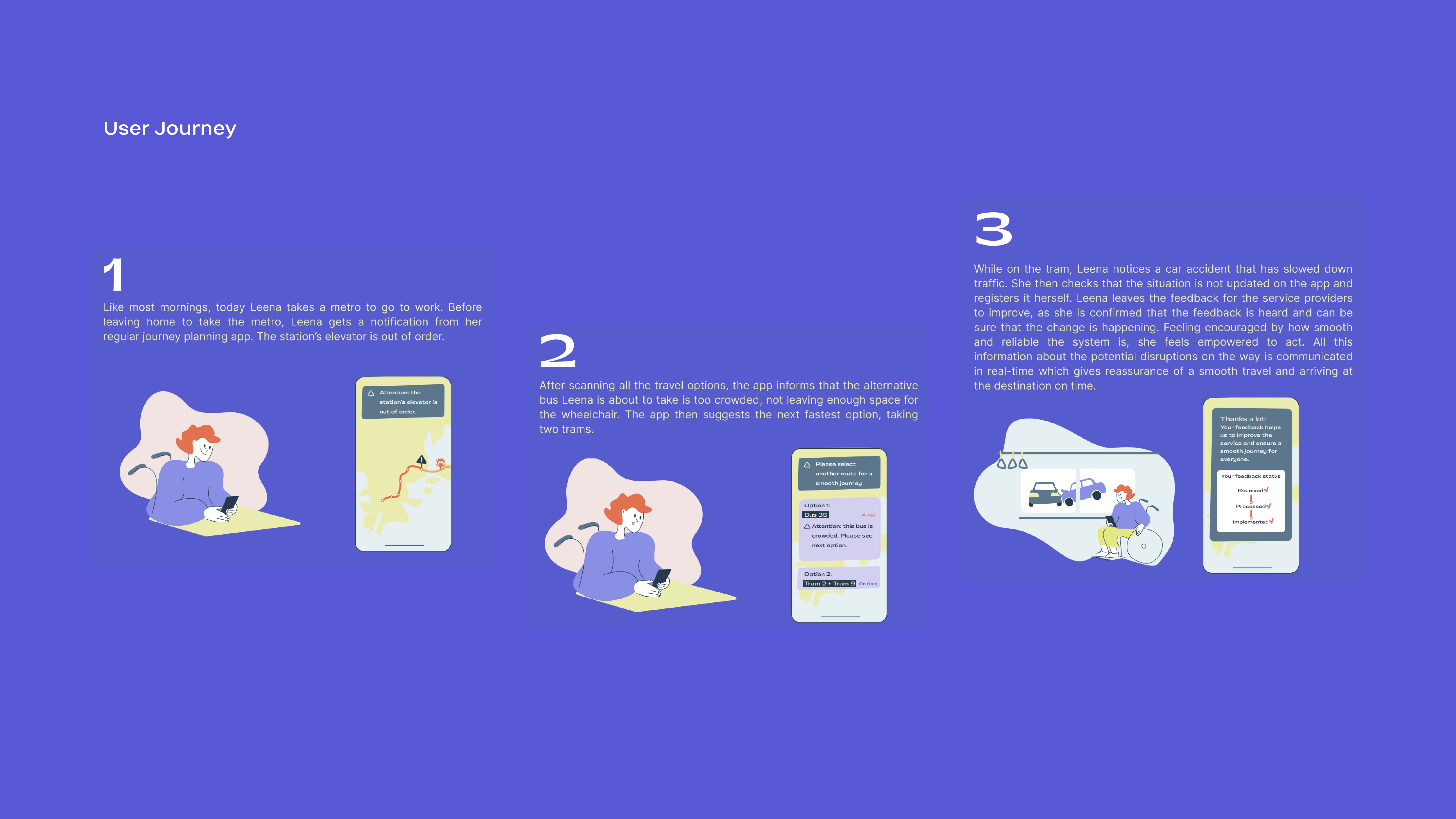 CIS - Centralised Information System A shared infrastructure that collects, processes, and distributes real-time accessibility information across the transport system. How it works: • Aggregates data from service providers, platforms, and users • Filters and verifies information through a central system • Redistributes relevant updates via existing apps and channels Users become active contributors, not just service recipients. The experience shift: • Before: Fragmented information · unreliable planning · low trust • After: Real-time updates · shared responsibility · empowered users The system supports smoother journeys, especially for people with accessibility needs.