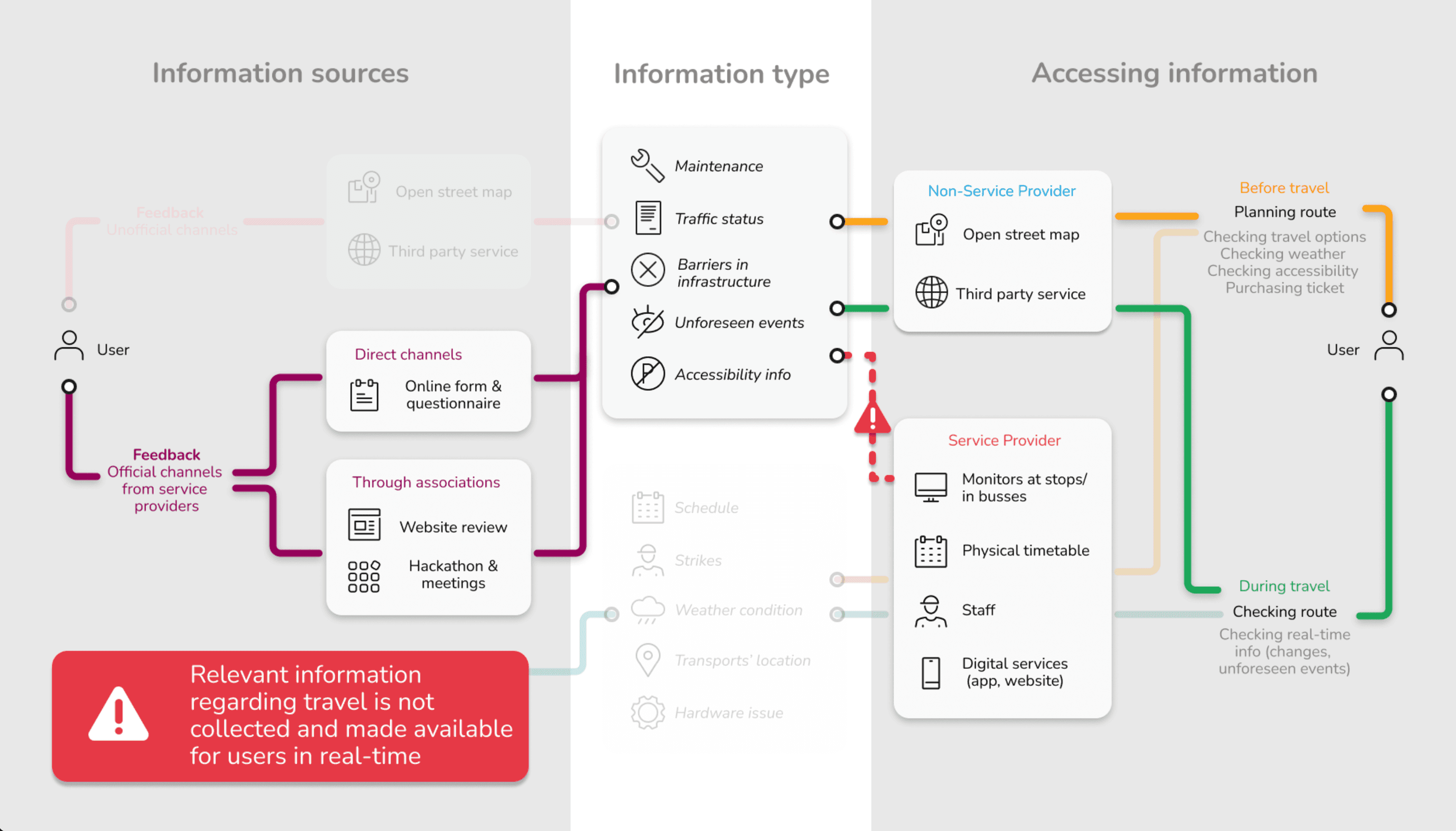 Information gaps break accessibility: Critical real-time updates (disruptions, inaccessibility, crowding) often don’t reach users when they need them. Systems are fragmented: Multiple stakeholders interpret and communicate information differently, creating inconsistency and confusion. Users are passive - but shouldn’t be: Users hold valuable, real-time knowledge but lack a clear way to contribute it meaningfully.